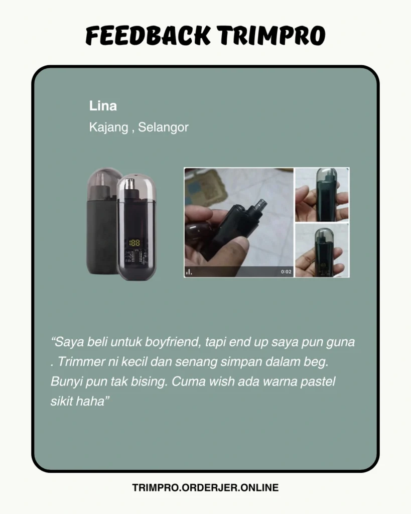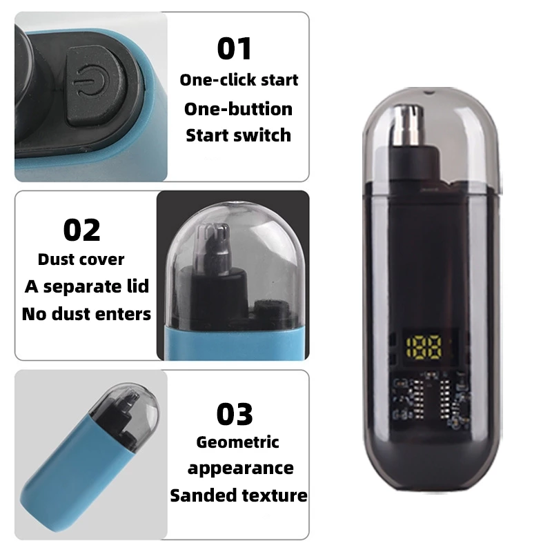 Penerangan Ringkas: TrimPro ialah pencukur bulu hidung elektrik pintar yang direka khas untuk mencukur dengan cepat, bersih dan selamat tanpa mencederakan kulit dalam hidung. Dengan bilah dua sisi berputar 6000 rpm dan kepala arka 3D, TrimPro mampu mencukur 360° dengan selesa serta melindungi tisu sensitif hidung. Dilengkapi port Type-C, mudah dicas dan mudah dibawa ke mana sahaja.